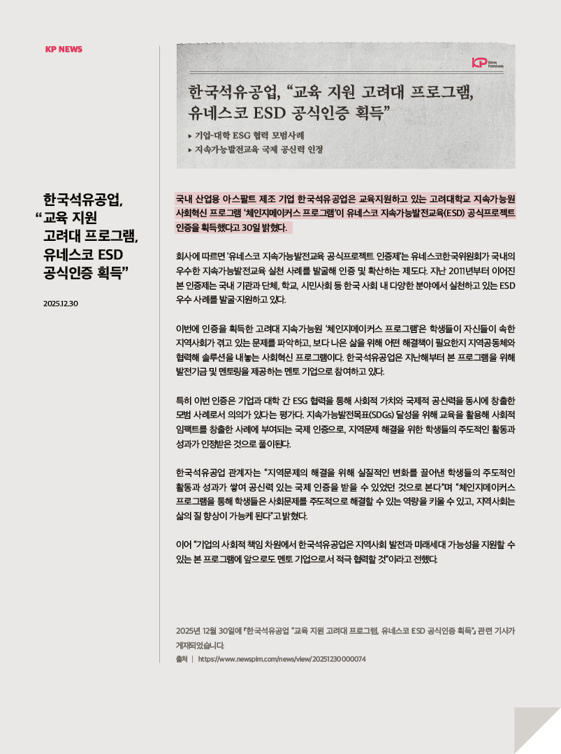 Home 한국석유공업, “교육 지원 고려대 프로그램, 유네스코 ESD 공식인증 획득” 한국석유공업, “교육 지원 고려대 프로그램, 유네스코 ESD 공식인증 획득” 2025.12.30 Facebook share Twitter share