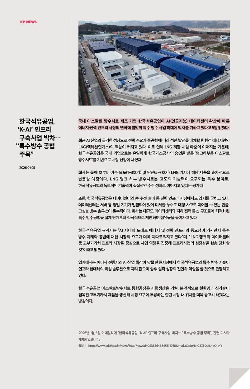 Home 한국석유공업, ‘K-AI’ 인프라 구축사업 박차… “특수방수 공법 주목” 한국석유공업, ‘K-AI’ 인프라 구축사업 박차… “특수방수 공법 주목” 2026.01.05 Facebook share Twitter share
